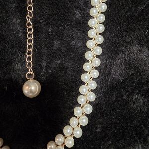 The Vintage Faux Pearl and Gold Thread Belt/Necklace Chain is a stylish accessory that can be worn as a necklace or a belt. This 48-inch chain features faux pearls and a gold thread design, giving it a unique and elegant look. Perfect for a birthday occasion, this vintage piece is from the 1980s and exudes a sense of beauty with its round pearl shape and adjustable features. Made of faux pearls and gold thread, this original necklace is a beautiful addition to any woman's jewelry collection. Unbranded.