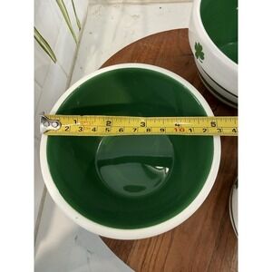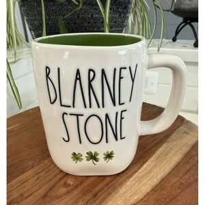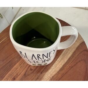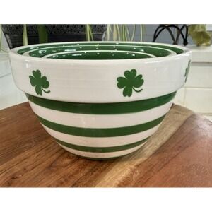 The product is a set of two Rae Dunn mugs Pinch Me and Blarney Stone and three Terramoto ceramic stacking bowls in white and green, featuring a shamrock and stripes pattern. Made of ceramic, these oddly shaped mugs and round bowls are perfect for St. Patrick's Day. These decorative items are machine washable, dishwasher safe, and are a licensed reproduction of the Rae Dunn brand and Terramoto Ceramic brand. With an Irish theme, these pottery pieces are a stylish addition to your kitchen or dining table. Lot of 5-2 Ray Dunn mugs and 3 Terramoto bowls.
