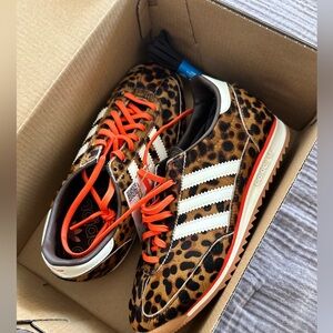 Adidas sneakers with a striking animal print. Features bright orange laces and signature white stripes.