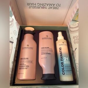 Pureology hair care collection featuring Pure Volume shampoo, conditioner, both in 9oz and Color Fanatic spray in 6.7oz. New with limited edition box. $115 value (Sephora and Ulta).