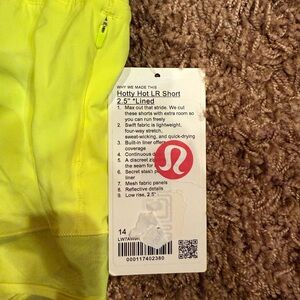 Vibrant lime shorts by Lululemon. Lightweight and quick-drying. Ideal for active wear.