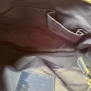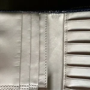 Few small scuffs on the bag that can probably be spot treated. Some wear in the wallet but the outside is in perfect condition.