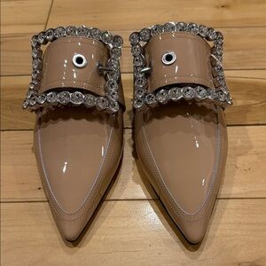 Elegant beige mules with crystal accents. Pointed toe design. Perfect for a sophisticated look.