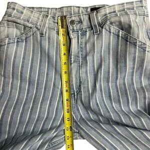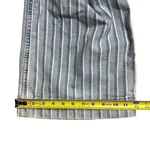 These AG Adriano Goldschmied jeans feature a wide-leg style in a blue engineer striped pattern, designed for women. They are made from a blend of cotton, polyester, and polyurethane, offering a comfortable fit with a high rise. Manufactured in Mexico, they are machine washable for easy care. Suitable for casual outings or relaxed gatherings, these jeans are pre-owned.