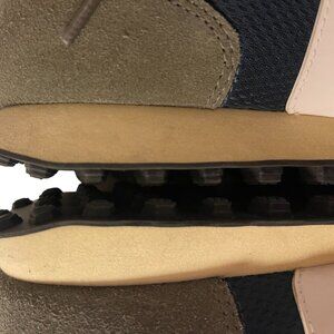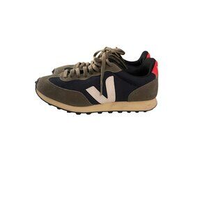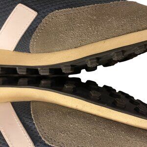 Chic Veja sneakers with khaki suede and navy mesh. Cream logo and red heel detail. Modern and comfy.