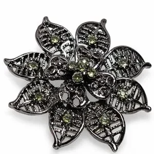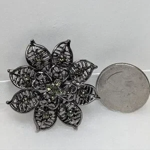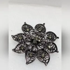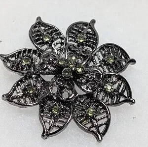Striking vintage floral brooch featuring an openwork flower design in a dark gunmetal tone, accented with soft green faceted crystals. The layered petal construction gives this piece depth and texture, making it a standout accessory on jackets, sweaters, scarves, or handbags.