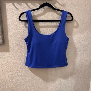 Royal Blue Fabletics tank with a stylish twist detail on the back, has a built-in bra with pads. Size large in excellent condition.