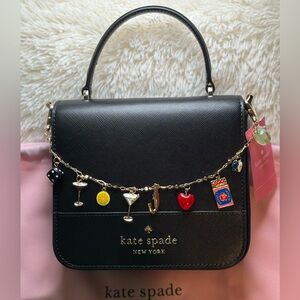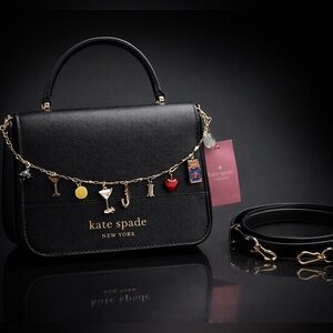 Chic black bag by Kate Spade. Adorned with a gold chain featuring playful charms. Ideal for stylish outings.