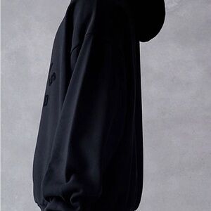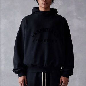 The Fear of God Essentials Black Hoodie features an oversized fit, long sleeves, an attached hood, a bold "ESSENTIALS" graphic on the front, and a rubber brand logo on the hood.