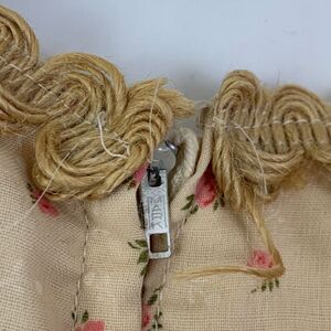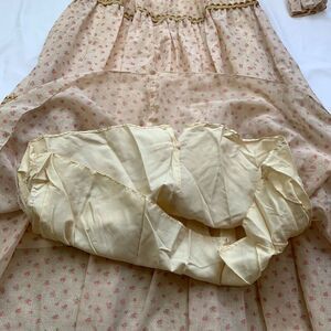 Back zip design with high round neck, darted bodice. Cream ivory pink floral fabric. Jute trim inset, fit and flare look, tiered, lined, sleeves are even darted at elbows. Union made in USA.