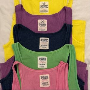 Vibrant camisole set from PINK Victoria's Secret. Features pink, green, purple, and yellow colors. Soft and stylish for everyday wear. Set of five. Excellent condition.