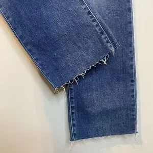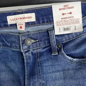 The Lucky Brand Sweet Mid Rise Straight Cutoff Jeans in women's size 8 with a medium wash are a stylish and versatile choice for the modern wardrobe. Made from a comfortable cotton blend denim fabric, these jeans feature a classic mid-rise fit with a straight leg and ankle-length cutoff. The solid blue color, zip and button closure, and 5-pocket design add to the timeless appeal of these jeans. Perfect for all seasons, these Lucky Brand jeans are a must-have for any woman looking for a blend of fashion and comfort in her everyday look.