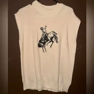 Cream sleeveless sweater featuring a cowboy graphic with 'Howdy' text.