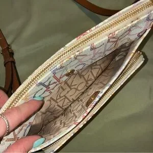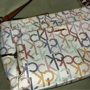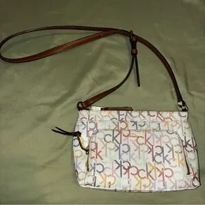 Chic crossbody with vibrant CK logo pattern. Colorful but subtle. Front pocket replicates wallet.