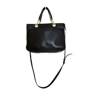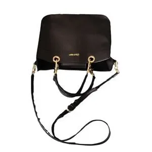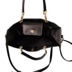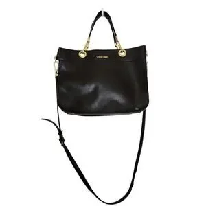 Preowned: Stylish, black "Sandra" leather tote/satchel handbag with double strap handles / gold tone hardware / grommet accents / interior flap magnetic snap closure / fabric lining / spacious interior / zip & slot pockets / detachable & adjustable shoulder strap / bottom protective feet by Calvin Klein.