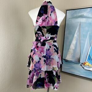 Alex Marie Dress Halter A line Mini sleeveless Pink Black Floral Tiered Size 8
