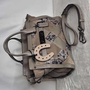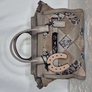 LIKE NEW Coach Large Swagger Suede & Leather Patchwork Tote Handbag With Horseshoe Charm. 1 hang tag, Crossbody Strap. CLEAN. (1 tiny ink mark in last pic... barely noticeable) Perfect for adding a touch of elegance to any outfit.