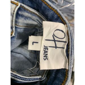 Embroidered/studded pre-owned blue jeans, 75% cotton, 23% spandex, 2% spandex, hand wash cold