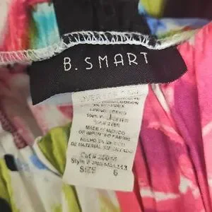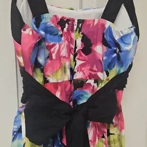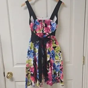 Vibrant floral dress with rouching on bodice and a wide black belted empire waistline with tie in back. Middle zipper back closure. Bustline has sewn in foam for structure and modesty. Pretty feminine dress that would be perfect for so many occasions.