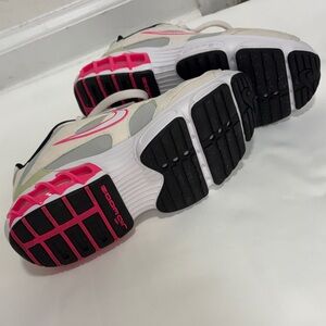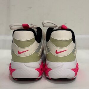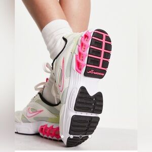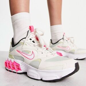 Stylish Nike sneakers for women. Cream base with pink accents. Comfortable and trendy design.