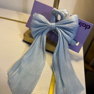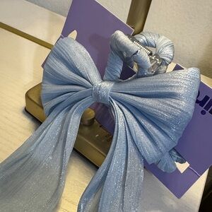 Elegant light blue hair bow with a shimmering finish. Perfect for adding a touch of sparkle to any hairstyle.