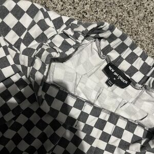Stylish checkered skater skirt. Features a black and white pattern.