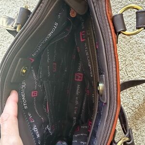 This two-tone shoulder bag is a classic style from Stone Mountain, a brand known for its functional and durable designs. The bag is constructed from a blend of brown and black leather, often described as soft or "butter soft" genuine leather.