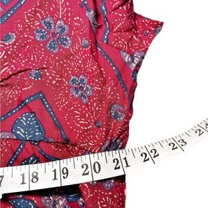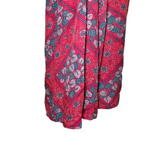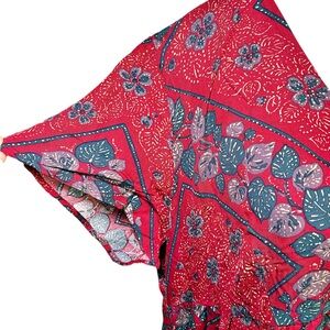 This dress is a flowing, bohemian-style maxi with an easy, relaxed drape. It features a rich red base covered in an intricate allover print of teal-blue leaves, small florals, and geometric framing, creating a tapestry-like pattern that feels both earthy and artistic.