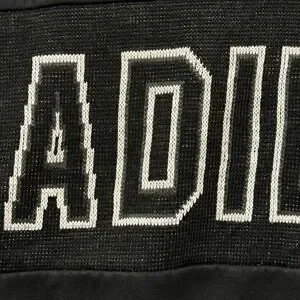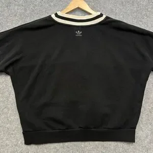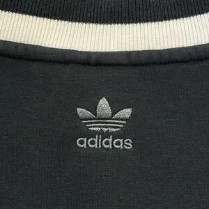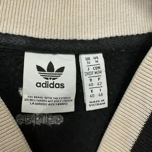 Adidas Originals Adibreak V-neck sweatshirt in black with classic varsity styling. Soft fleece sweatshirt body paired with a contrasting sweater-knit chest panel featuring bold ADIDAS spellout lettering. Finished with a striped ribbed V-neck, ribbed cuffs and hem, and an embroidered Trefoil logo at the back neck. Easy pullover style with a relaxed athletic fit that works for everyday wear or streetwear layering. Tagged men's size Medium. Made in Vietnam. A sharp, distinctive Adidas Originals piece with strong visual impact.