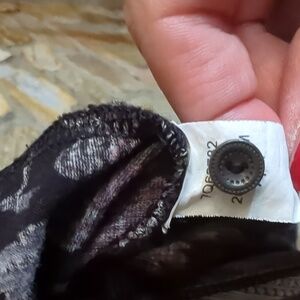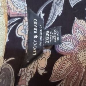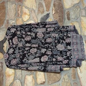 excellent pre-owned condition, size 2x from Lucky Brand. Black with gray and pink floral pattern throughout, v-neck, 3/4 length sleeves. soft stretchy fabric. see photos from more details and approximate measurements.