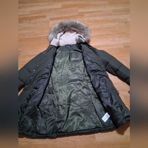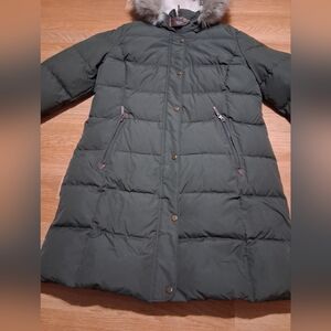 Elegant dark green puffer jacket. Features a cozy faux fur hood. Perfect for cold weather.
