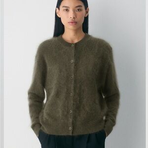 This is a crewneck button-up cardigan. It's knit with Aritzia’s Brushed Cashmere — lofty 100% cashmere yarn with a unique brushed and fluffy look, coveted for its distinctive softness and warmth. The finest available.