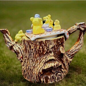Bring a little storybook magic into your home with this charming Paul Cardew “Teddy Bears’ Picnic” sculptural teapot. Designed to look like a cozy tree‑stump cottage, it features an adorable group of bears gathered around a tiny tea set on a red‑and‑white picnic cloth. Every detail — from the bark texture to the miniature cups — feels playful, warm, and full of personality.