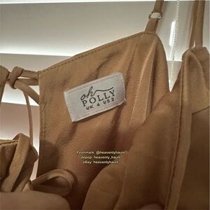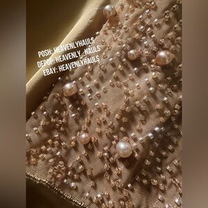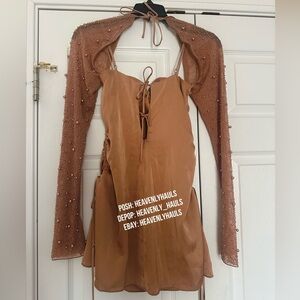 Oh Polly embellished a-line mini dress with GORGEOUS sheer beaded sleeves in beige, size 2. Adjustable straps with flirty bows (ties) throughout. Dress is fully lined