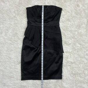 This black strapless sheath cocktail dress by White House Black Market features a peplum detail, adding a modern and sophisticated touch to the y2K-inspired design. Made from polyester, this knee-length dress is perfect for summer and spring parties or cocktails. The sleeveless style and zip closure make it easy to wear for any occasion, while the solid color and sleek silhouette provide a timeless and elegant look.