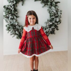 Charming red plaid dress with a delicate lace collar. Perfect for festive occasions.