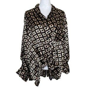 Rue Women's Brown Black Retro Print Tie Front Button Roll Tab Blouse Plus 3X