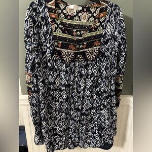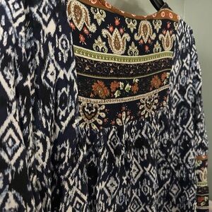 Chic blouse with floral and paisley patterns. Features navy, pink, and brown colors. Size small.