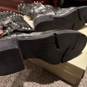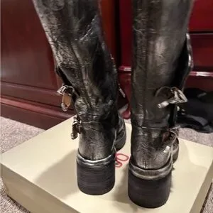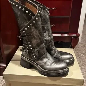 Elevate your Style with these Stunning Studded Antique Silver Leather Boots by A.S. 98 featuring Stud Trim ,Side Buckles, & Side Zippers.Like New with Box. Perfect for adding a Bold Touch to any outfit & Make a Statement.Size 11-But Fits Like a 10. Originally $629.95