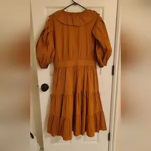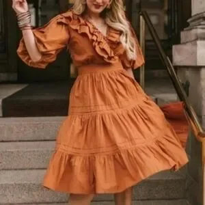 Chic terracotta midi dress with ruffled neckline. Flowy skirt and puff sleeves add elegance. Ideal for any event.