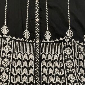 Anthropologie Tiny Black 3/4 Sleeve Embroidered Blouse Size Small. V-Neck. Button up front. White embroidered detailing. See thru material. 30% Silk. 70% Cotton. Bohemian style. See photos for measurements. EUC.