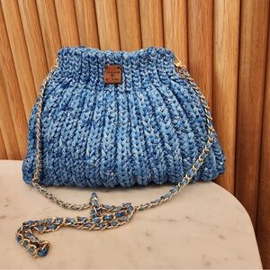 One of a kind handmade. Stylish and versatile blue woven bag with a chic chain strap. Perfect for any occasion.