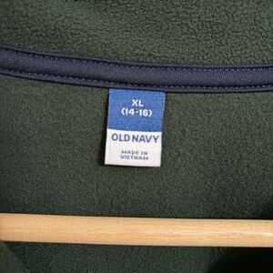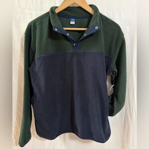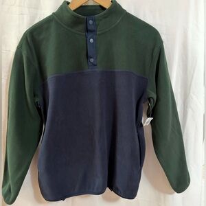 Soft fleece pullover in forest green with navy trim. Features a classic button-up collar.