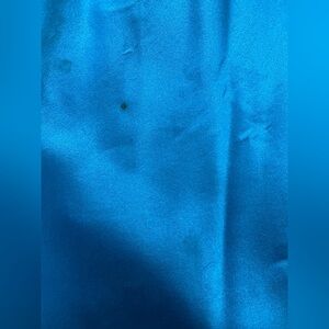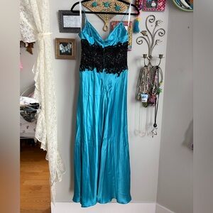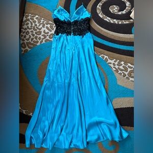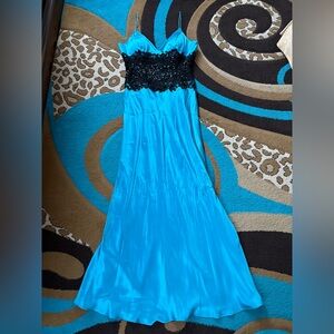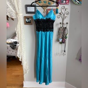 Chic turquoise formal dress with sheer black sequined lace panel. Perfect for elegant events. Plz see pics for stain on the bottom front/side of dress. First 3 stain pics are close ups of the small stains last pic is the full shot of the same zoomed in stain pics.
