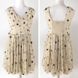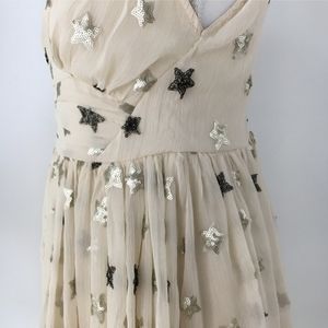 Gorgeous, ethereal fit + flare chiffon dress from Anthropologie designer Ranna Gill features shimmering metallic sequin stars in silver and black. Sleeveless, crossover V-neck, square back, gathered elastic in back, fit-and-flare silhouette with twirl skirt. Color is cream/palest blush pink. Fully lined.