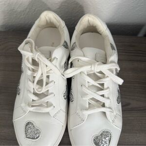 Stylish white sneakers with glittery heart details. Perfect for adding sparkle to any outfit.