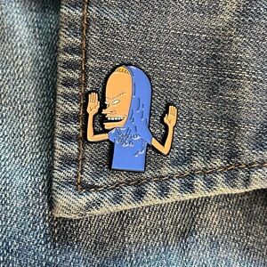 This high-quality metal pin captures Beavis in his iconic pose, with a purple/blue shirt over his head and arms raised. It's a perfect accessory for jackets, backpacks, hats, or pin collections, adding a touch of classic MTV pop culture humor to any item.