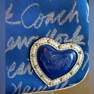 Elegant Coach wristlet in blue with silver script. Features a heart detail for a chic touch