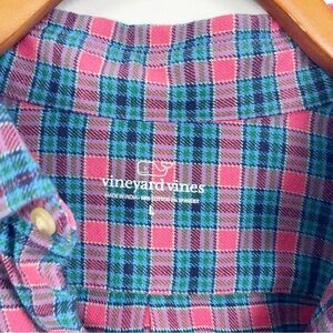 Classic Vineyard Vines plaid button-down in a preppy pink, blue, and green colorway. Soft, lightweight cotton with a touch of stretch for comfortable wear. Features the signature whale logo at the chest and a timeless button-front silhouette—perfect for casual days, layering, or coastal/preppy style.