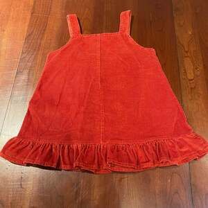 Gymboree Girls Orange Fox Corduroy Jumper Dress, size 3T. This adorable corduroy jumper dress features a playful fox face appliqué on the front and a charming ruffled hem. Made of 100% cotton, it's comfortable and durable for your little one. Perfect for fall and winter occasions, adding a touch of cuteness to any outfit. Excellent pre-owned condition with no visible flaws.